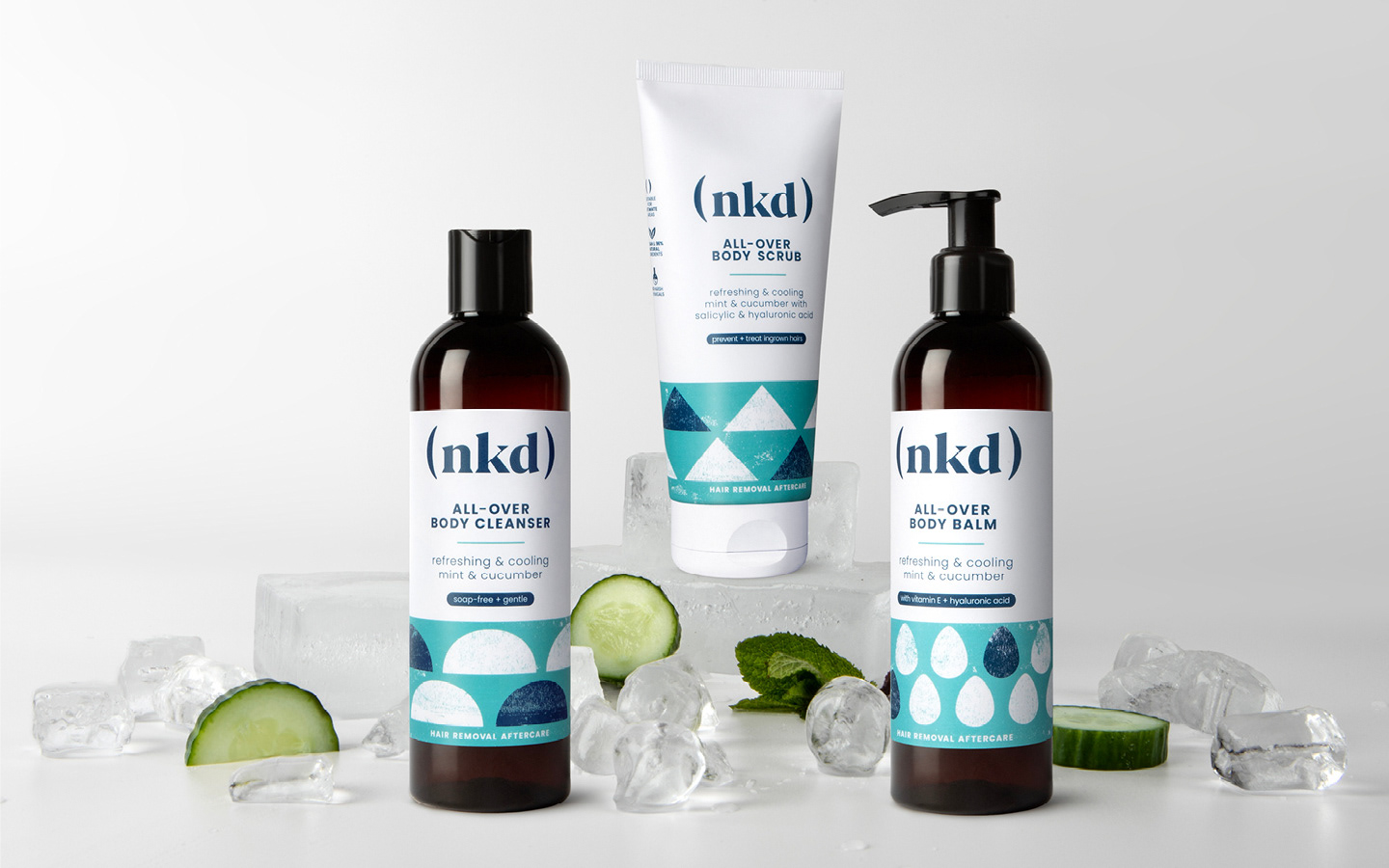 Idea: I repositioned the original brackets around the (nkd) name to signify the inclusivity which sits at the heart of the brand. The new brand had to appeal to both males and females, retain some of the original brand equity and build a new visual and verbal world around the brand. Patterns and colours were used to help identify the different product uses and scents. For the photographic assets, we organised an inclusive body and gender lifestyle shoot and a product shoot.